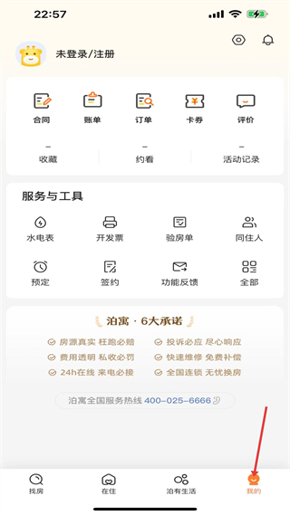 4、我的板塊可管理合同、訂單等,有水電表、開發(fā)票等工具,還有泊寓6大承諾,助力租客便捷管理租房事務(wù)功能實(shí)用。