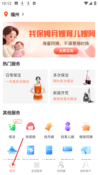 1、首頁福州,有找保姆月嫂育兒嫂入口,熱門服務(wù)含日常保潔等,其他服務(wù)有找保姆、月嫂等,功能入口清晰。