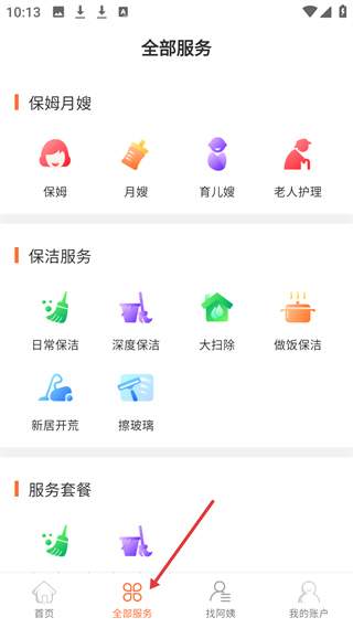 2、全部服務(wù)頁分保姆月嫂、保潔服務(wù)、服務(wù)套餐板塊,保姆月嫂有保姆等,保潔服務(wù)含日常保潔等分類全面。