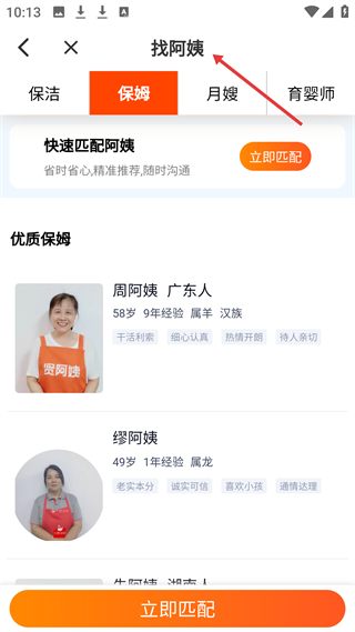 3、找阿姨頁保姆板塊,有快速匹配功能,展示周阿姨58歲9年經(jīng)驗(yàn)、繆阿姨49歲1年經(jīng)驗(yàn)等優(yōu)質(zhì)保姆,可立即匹配。