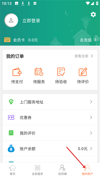 4、我的賬戶頁需登錄使用,有我的訂單、上門地址、優(yōu)惠券等功能入口,可管理賬戶余額評(píng)價(jià)等。