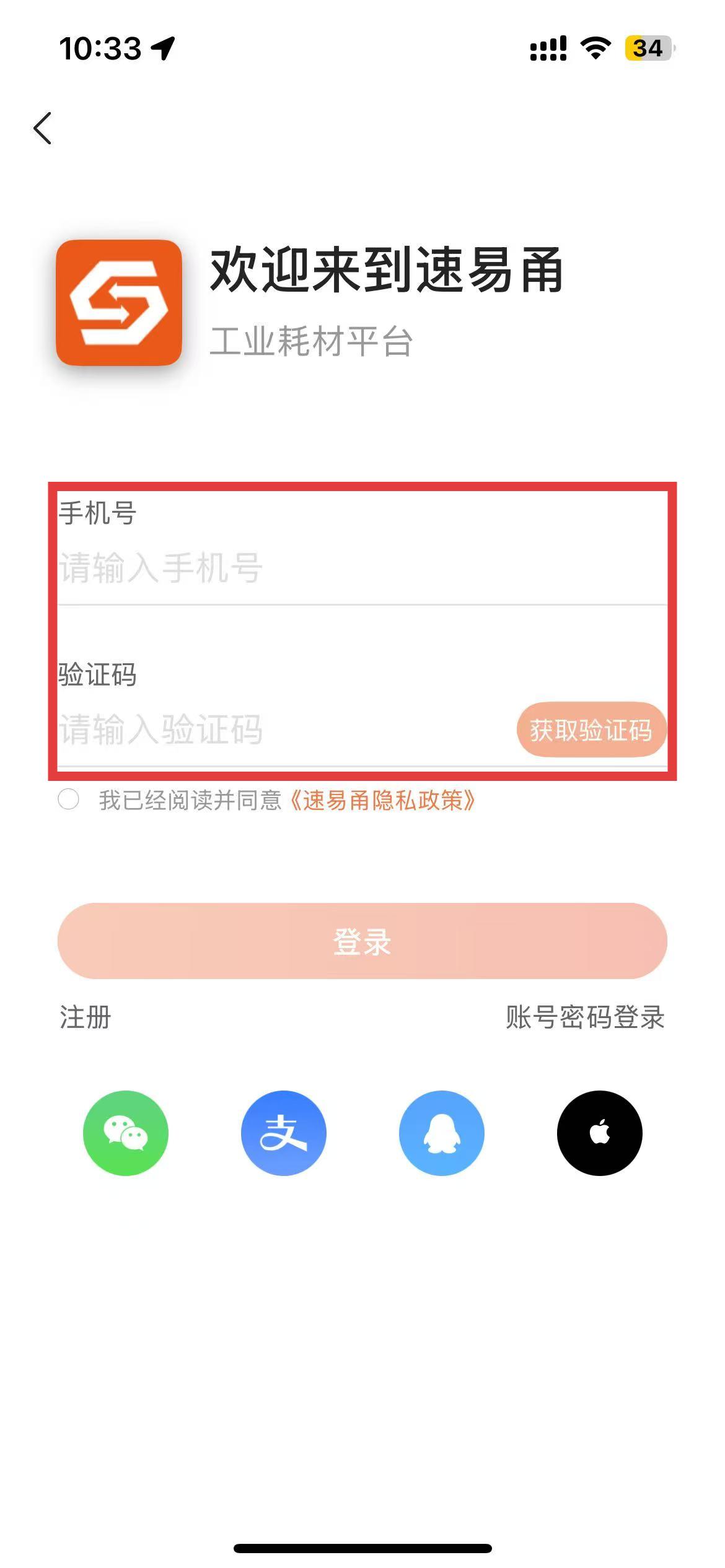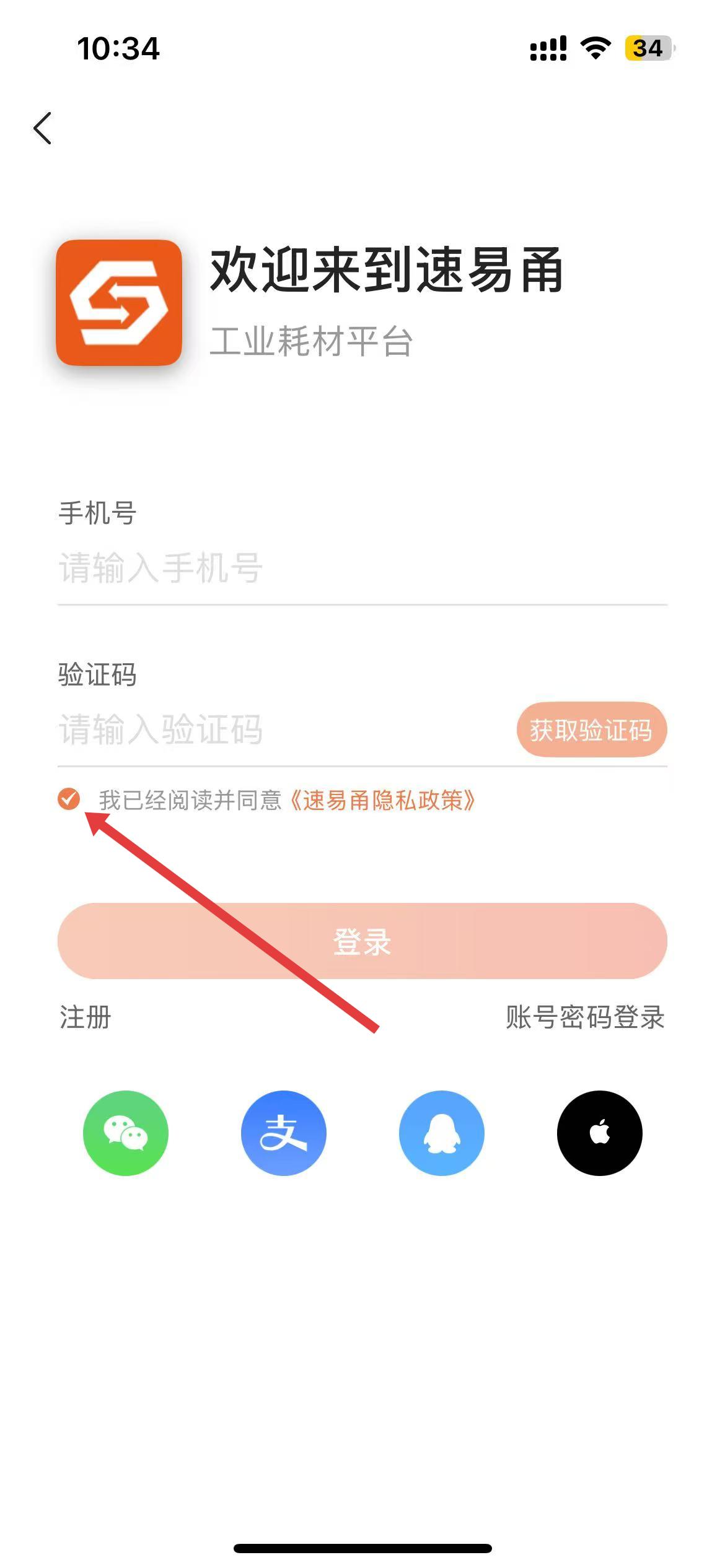 1、打開(kāi)速易甬,進(jìn)入登錄頁(yè),勾選我已經(jīng)閱讀并同意速易甬隱私政策,可選擇手機(jī)號(hào)驗(yàn)證碼登錄,或第三方快捷登錄。