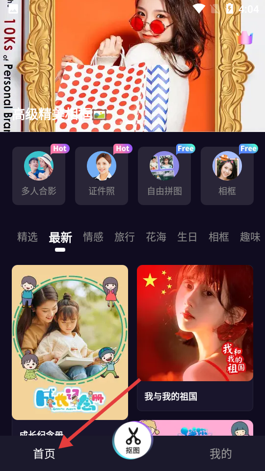1、首頁(yè)界面布局清晰,有多人合影等熱門(mén)功能,下方是最新等分類(lèi)模板,還有醒目的摳圖按鈕,方便快捷。