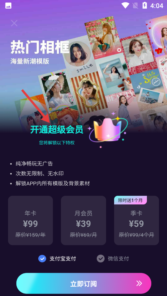 2、會(huì)員開(kāi)通頁(yè),開(kāi)通超級(jí)會(huì)員引人注目,展示特權(quán)如無(wú)廣告、無(wú)水印等,提供年卡、月會(huì)員等套餐,限時(shí)優(yōu)惠。