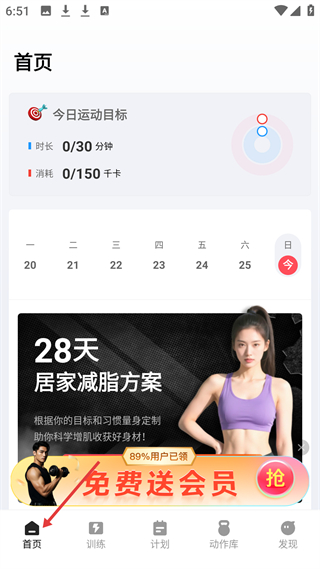 1、首頁展示今日運(yùn)動(dòng)目標(biāo)時(shí)長(zhǎng)30分鐘、消耗150千卡,還有28天居家減脂方案推薦,提供運(yùn)動(dòng)計(jì)劃與會(huì)員福利。