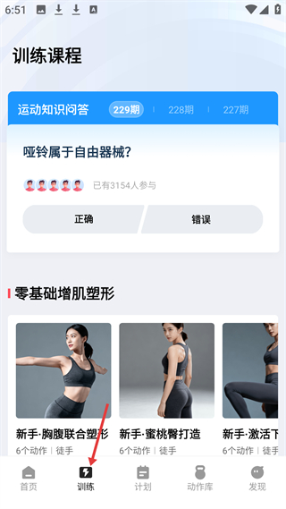 2、訓(xùn)練頁有運(yùn)動(dòng)知識(shí)問答啞鈴是否屬自由器械,展示零基礎(chǔ)增肌塑形課程,如胸腹聯(lián)合塑形、蜜桃臀打造等。
