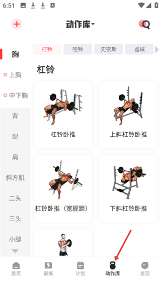 4、動(dòng)作庫(kù)頁按胸、背等部位分類,展示杠鈴臥推等動(dòng)作,提供杠鈴、啞鈴等器械的健身動(dòng)作參考。