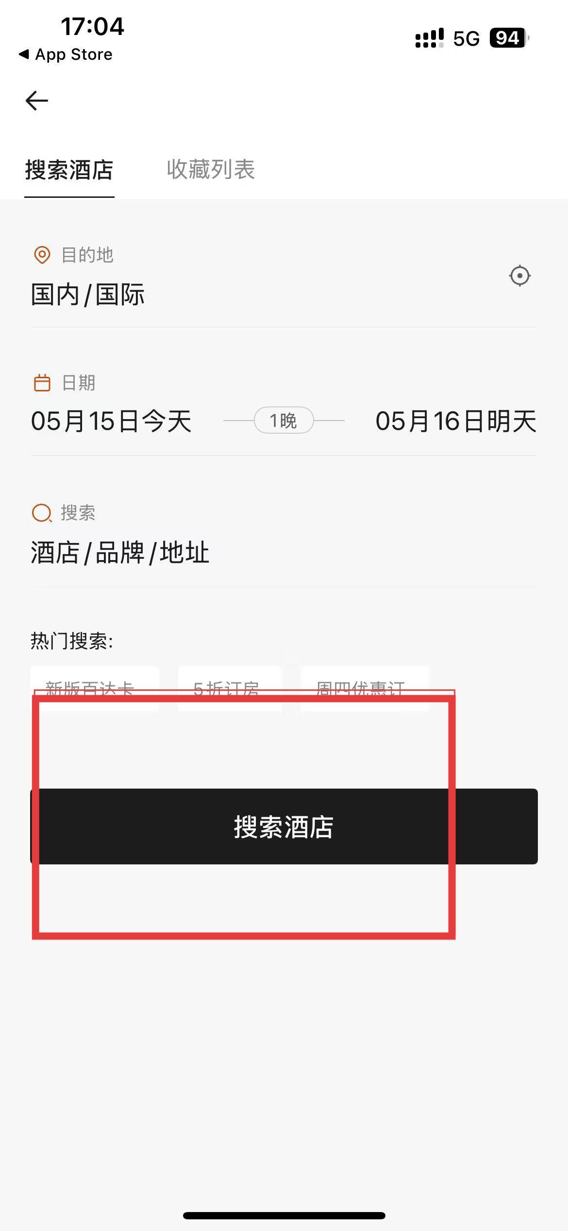 2、在這個界面可以看見我們將要預訂的日期酒店品牌還有地址,選好之后我們選擇搜索酒店。