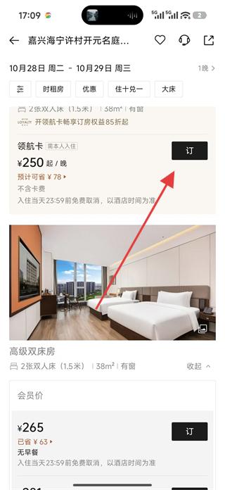 4、在房間選擇頁面查看領航卡價、會員價等不同價格的房間,選擇合適的房間類型后,點擊訂完成酒店預訂操作,享受舒適的住宿體驗。