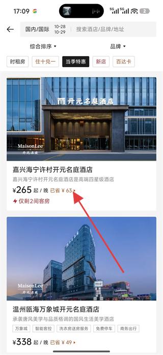 2、在搜索結果頁面瀏覽當季特惠板塊下的酒店,如嘉興海寧許村開元名庭酒店等,查看酒店的價格、已省金額與剩余客房數(shù)量,挑選性價比高的酒店。