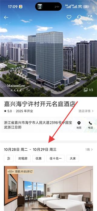 3、進入酒店詳情頁選擇入住與離店日期,確認入住時間,以便查看該日期下的房間類型與價格,為預訂做準備。