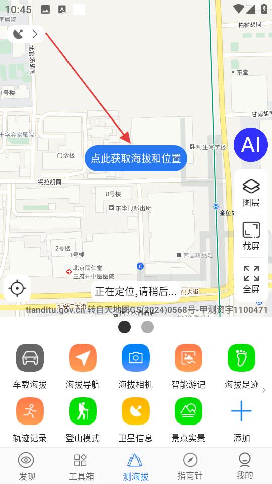 1、進入測海拔頁面,點擊點此獲取海拔和位置按鈕,等待定位完成,可查看當(dāng)前所處位置的海拔信息,還能使用車載海拔海拔導(dǎo)航等功能輔助戶外出行。