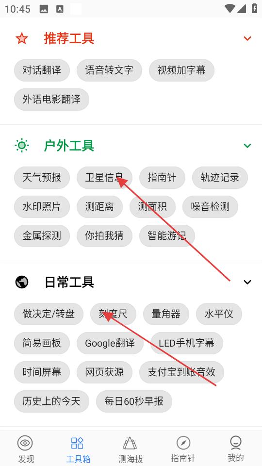 2、切換至工具箱頁面,在戶外工具分類里,選擇衛(wèi)星信息指南針等工具,也可在日常工具中找到刻度尺量角器等實用功能,滿足戶外測量等需求。