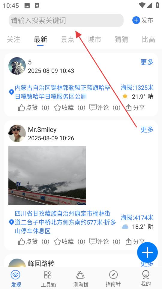 3、進入發(fā)現(xiàn)頁面,在搜索欄輸入關(guān)鍵詞,瀏覽最新景點等板塊內(nèi)容,查看其他用戶分享的戶外地點海拔天氣等信息,還能發(fā)布自己的戶外動態(tài)。