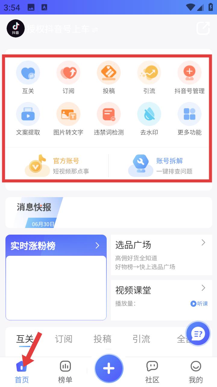 2、首頁聚合互關(guān)、訂閱、投稿等多樣功能,還有實(shí)時(shí)漲粉榜、選品廣場(chǎng)與視頻課堂,覆蓋賬號(hào)運(yùn)營、內(nèi)容創(chuàng)作到流量分析,助力用戶高效管理短視頻賬號(hào)。