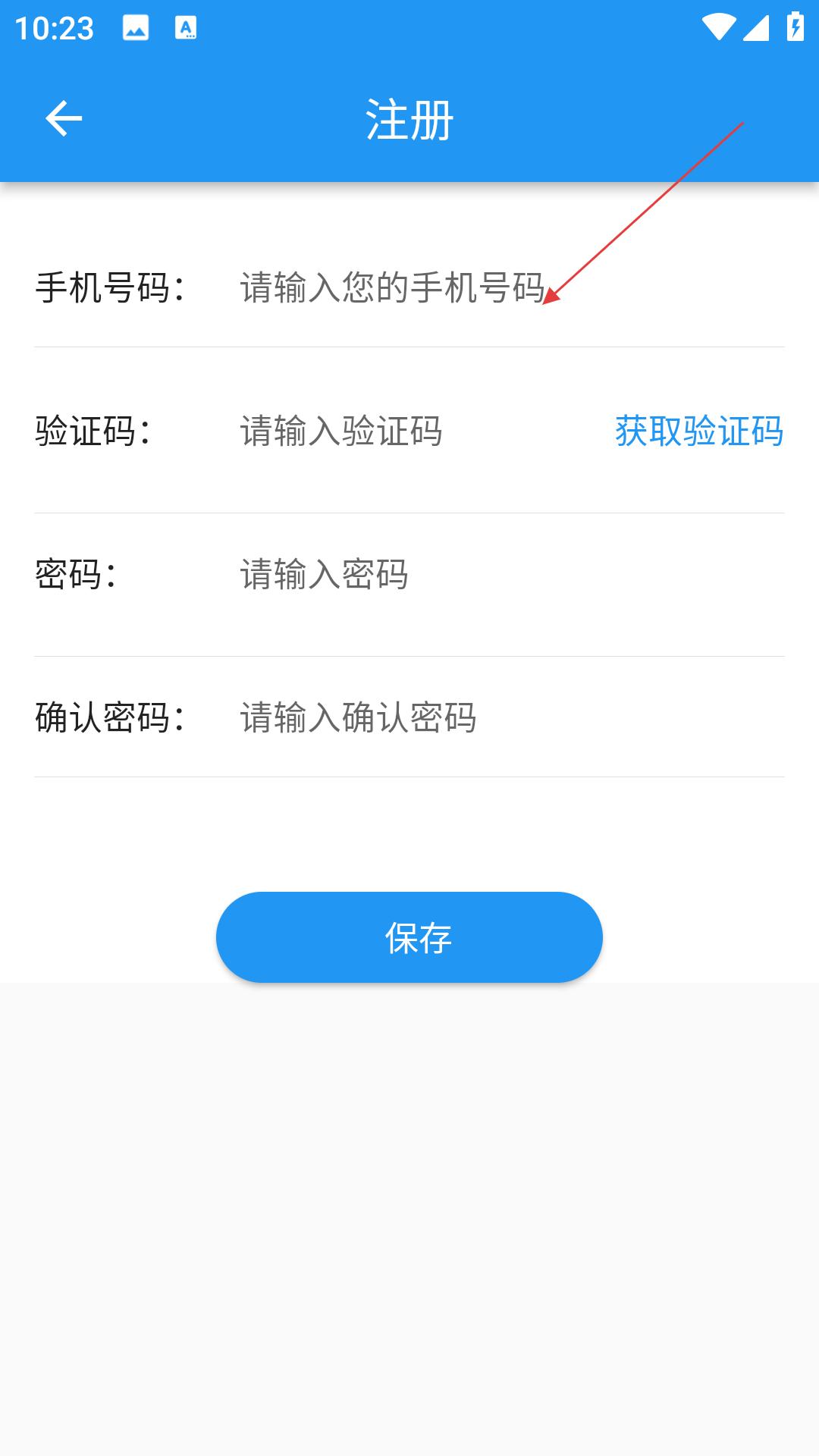 3、注冊界面,用戶可輸入手機號碼、驗證碼、密碼和確認密碼進行注冊,然后點擊保存完成注冊。