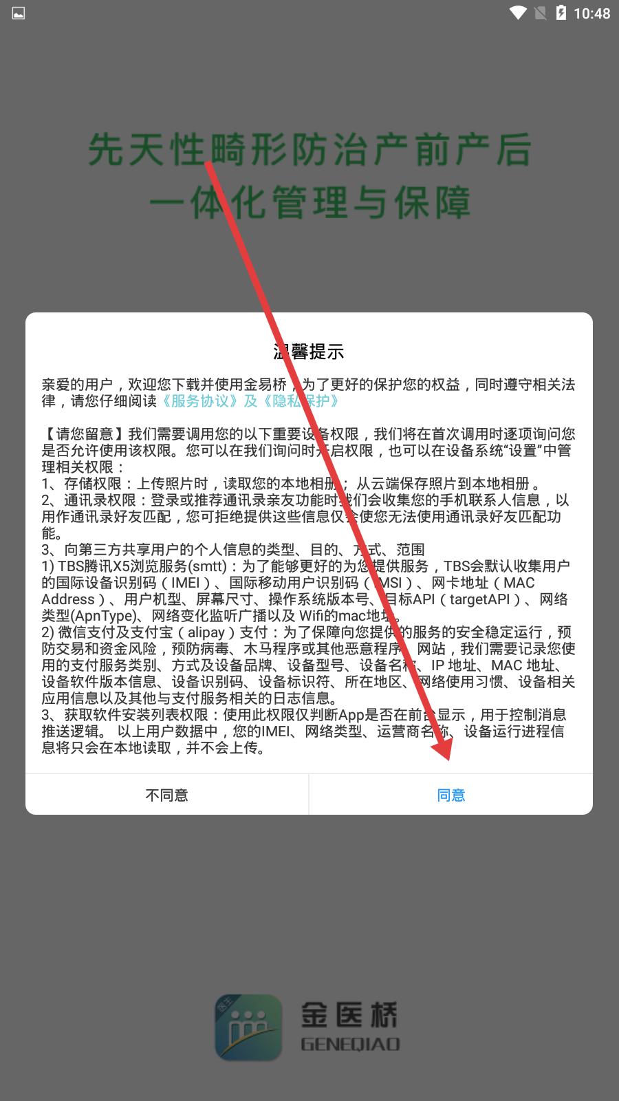 1、下載安裝完成后進(jìn)入,需在用戶協(xié)議和隱私政策界面點(diǎn)擊同意,接受相關(guān)條款后才能進(jìn)入應(yīng)用。