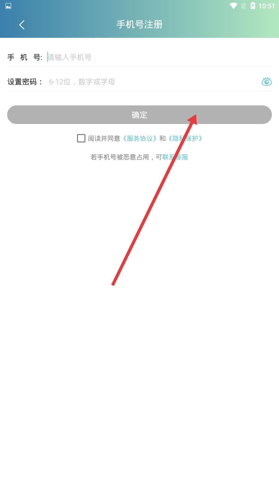 3、在金醫(yī)橋手機(jī)號(hào)注冊(cè)界面,輸入手機(jī)號(hào)并設(shè)置6-12位數(shù)字或字母的密碼,勾選閱讀并同意相關(guān)協(xié)議后,點(diǎn)擊確定按鈕完成注冊(cè)。