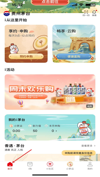 1、首頁有享約申購每日9.12點(diǎn)預(yù)約、暢享云購等板塊,還有周末歡樂購活動(dòng),可查看小茅運(yùn)、耐力值等個(gè)人申購信息。
