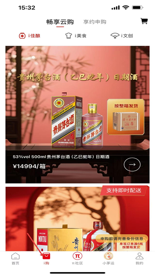 2、i購頁暢享云購有i佳釀等分類,主推乙巳蛇年茅臺(tái)日期酒整箱發(fā)貨,還展示其他茅臺(tái)產(chǎn)品,支持即時(shí)配送。