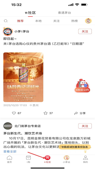 3、π社區(qū)頁有推薦等板塊,展示乙巳蛇年茅臺(tái)日期酒活動(dòng)、門店潮飲藝術(shù)場(chǎng)資訊,可互動(dòng)關(guān)注,了解茅臺(tái)文化動(dòng)態(tài)。