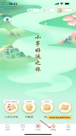 4、小茅運(yùn)頁國風(fēng)界面呈現(xiàn)小茅好運(yùn)之旅,有小茅運(yùn)申購、學(xué)釀酒等入口,申購前需完善身份信息,可參與活動(dòng)獲權(quán)益。