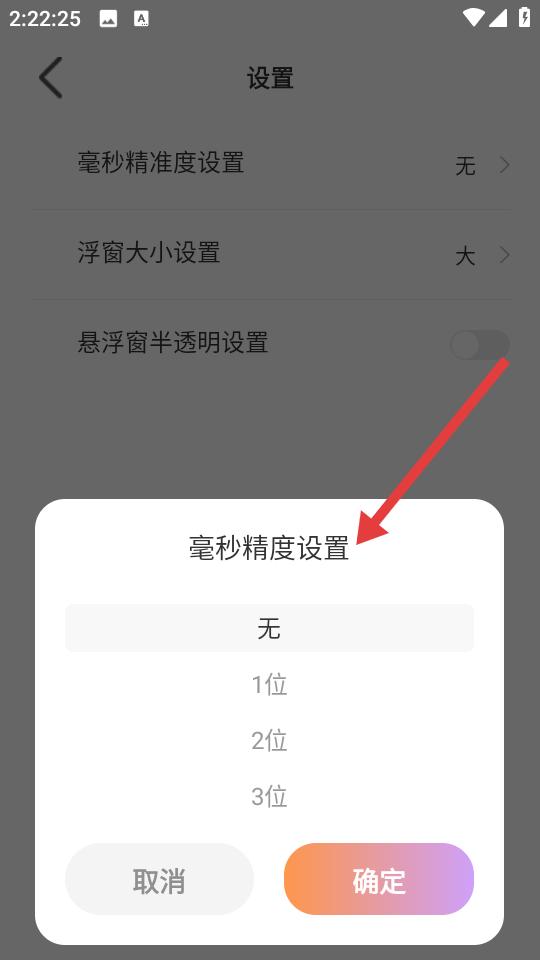 2、設(shè)置頁面點擊毫秒精準(zhǔn)度設(shè)置,在彈出的選擇框中挑選1位、2位或3位精度,確認(rèn)后保存,使懸浮倒計時精確到毫秒。