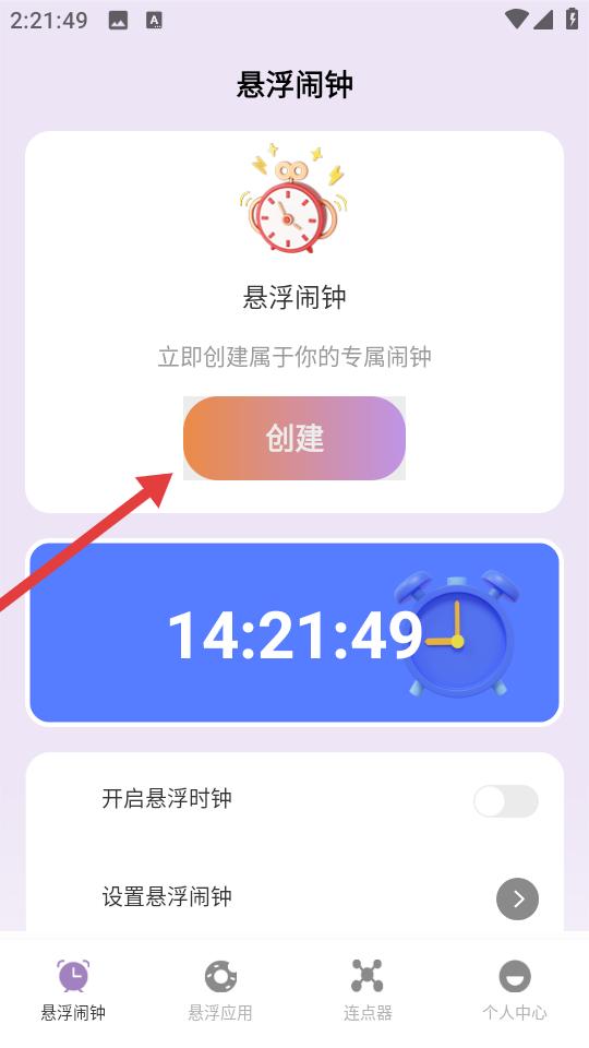 1、進(jìn)入懸浮鬧鐘主界面點擊創(chuàng)建按鈕可定制專屬鬧鐘,也能開啟懸浮時鐘開關(guān),通過設(shè)置懸浮鬧鐘選項調(diào)整參數(shù),搭建個性化時間提醒。