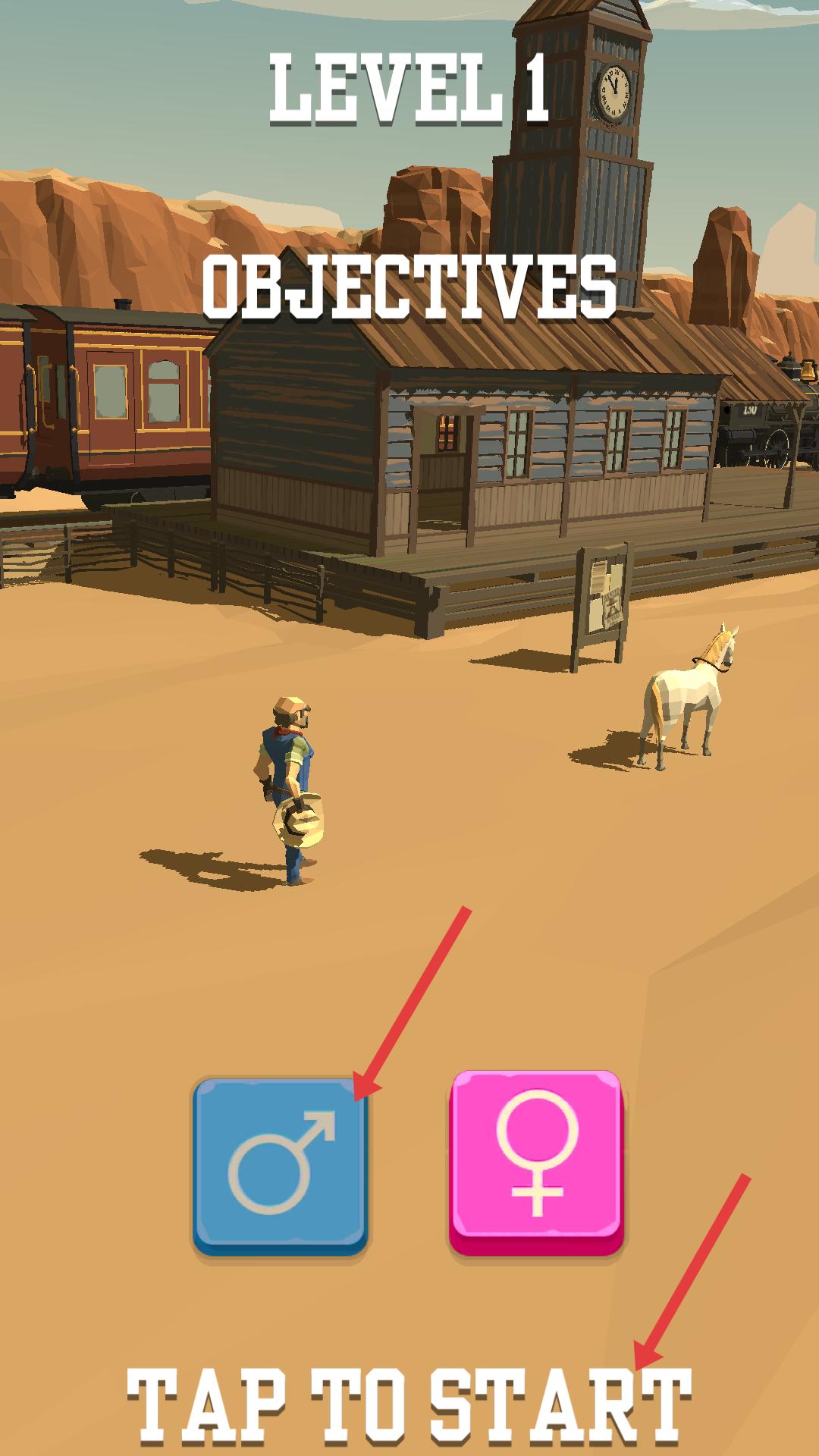 1、游戲第一關(guān)界面,有西部風(fēng)格場(chǎng)景,下方有性別選擇按鈕和開(kāi)始游戲提示,選擇性別后,點(diǎn)擊箭頭所指位置,即可開(kāi)始第一關(guān)游戲,開(kāi)啟西部冒險(xiǎn)。