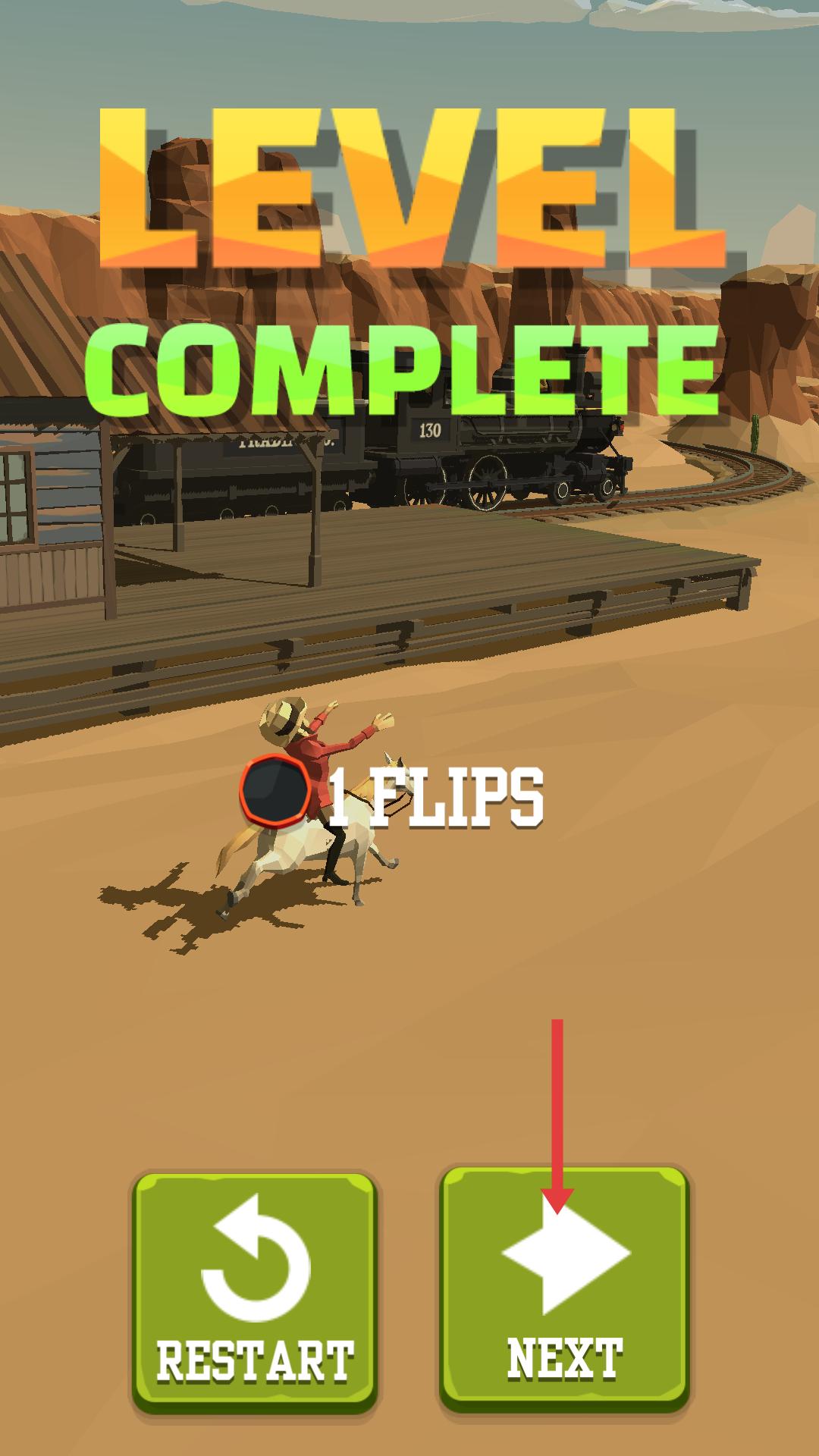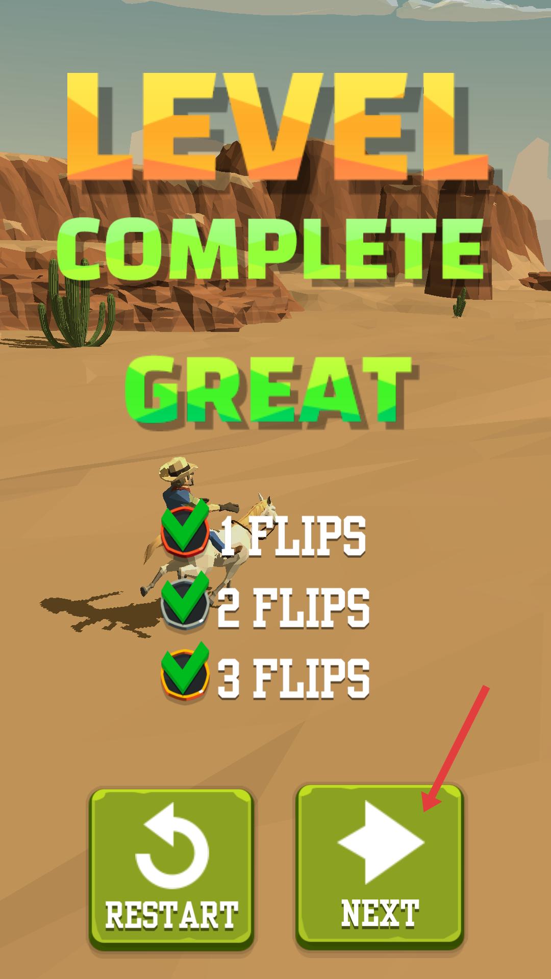 4、關(guān)卡完成后,界面顯示完成比賽,并列出完成的翻轉(zhuǎn)次數(shù),若想繼續(xù)挑戰(zhàn),點(diǎn)擊NEXT按鈕,進(jìn)入下一關(guān),繼續(xù)在西部場(chǎng)景中冒險(xiǎn),提升游戲表現(xiàn)。