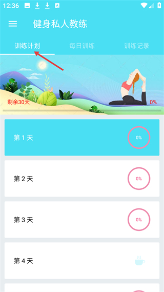 1、訓練計劃頁展示30天訓練周期,按天規(guī)劃任務,可查看每日訓練完成進度,助力系統(tǒng)開展健身計劃。