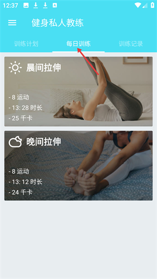 2、每日訓練頁有晨間、晚間拉伸課程,標注運動數(shù)、時長和卡路里消耗,幫助日常拉伸鍛煉。