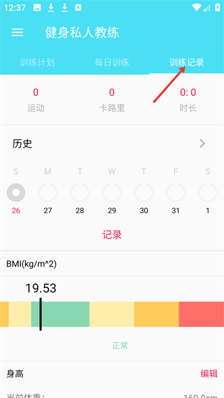 3、訓練記錄頁可看運動次數(shù)、卡路里及時長,還有歷史日歷和BMI數(shù)據(jù)19.53,正常,記錄健身軌跡。