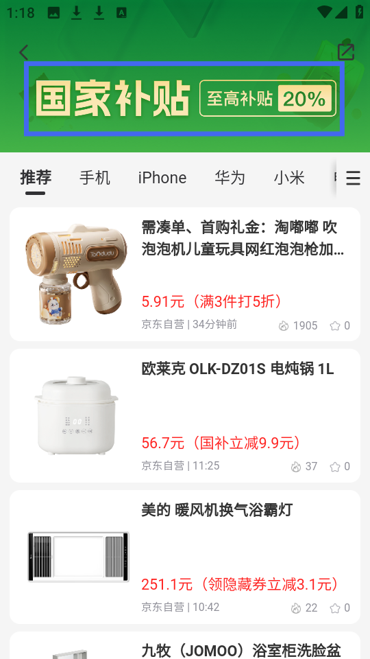 3、國(guó)家補(bǔ)貼頁(yè)面明示至高20補(bǔ)貼羅列玩具、電燉鍋等商品,標(biāo)注國(guó)補(bǔ)立減等優(yōu)惠,均來(lái)自京東自營(yíng)助用戶選購(gòu)實(shí)惠好物。
