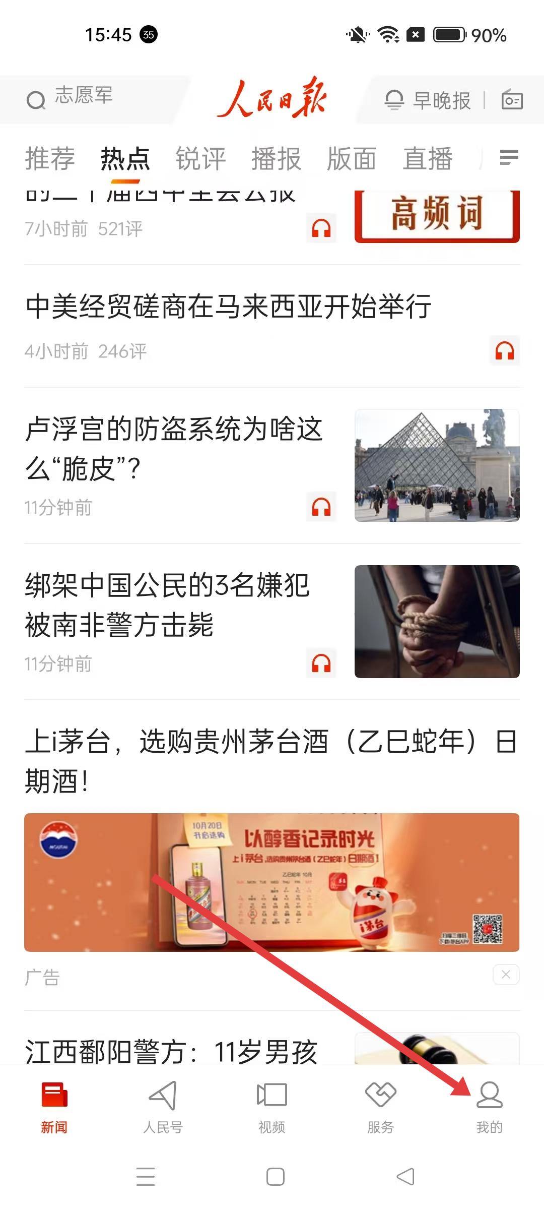 2、進入APP首頁,頂部有搜索欄,可搜索新聞內(nèi)容,下方展示熱點新聞資訊,底部有新聞、人民號等功能入口,點擊我的可進入個人界面。