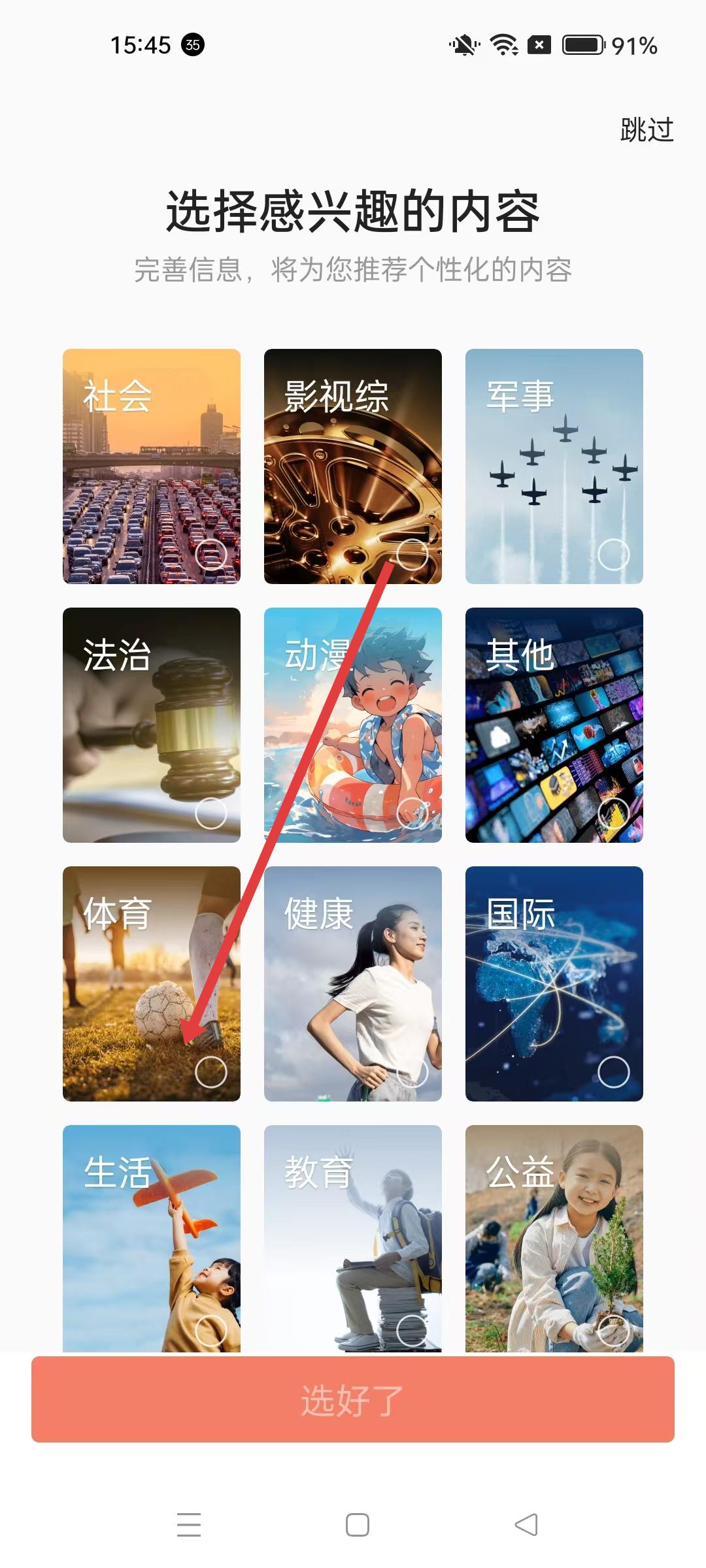 1、打開人民日報APP,首先會看到選擇感興趣內(nèi)容的界面,有社會、影視綜、軍事等多個分類板塊,選擇后可獲得個性化內(nèi)容推薦。