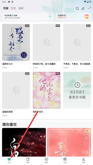 4、點擊底部書架,進入書架頁面,可查看已添加的小說,還有猜你喜歡板塊,能發(fā)現(xiàn)更多可能感興趣的作品。