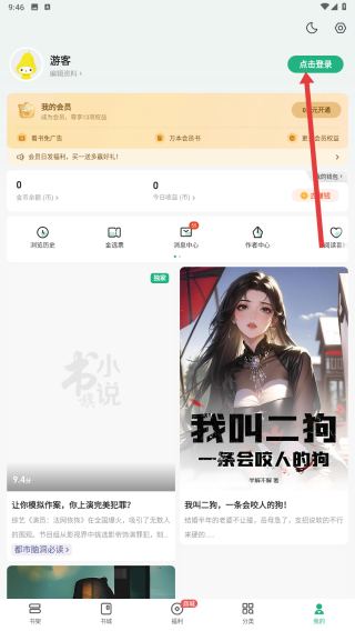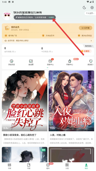 3、登錄后,個人頁面會顯示賬號相關(guān)標(biāo)識,還有會員等權(quán)益板塊,也能看到系統(tǒng)推薦的其他小說內(nèi)容。