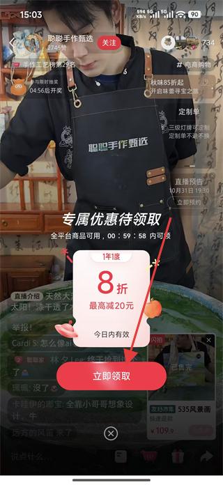 2、當(dāng)專屬優(yōu)惠待領(lǐng)取彈窗出現(xiàn)時,點(diǎn)擊立即領(lǐng)取,獲取年度8折最高減20元的優(yōu)惠,以便在購物時享受折扣。