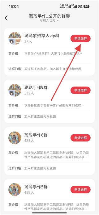 4、進(jìn)入群聊頁面選擇聰聰家娘家人vip群等群聊,點(diǎn)擊申請進(jìn)群,加入主播粉絲群,與其他粉絲交流互動,獲取更多購物福利。