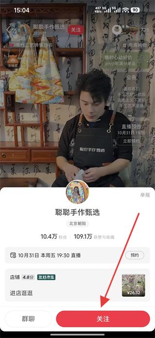 3、領(lǐng)取優(yōu)惠后點(diǎn)擊主播頭像,進(jìn)入主播主頁,查看主播粉絲數(shù)、獲贊收藏及店鋪評分,點(diǎn)擊關(guān)注,成為主播粉絲,及時獲取直播動態(tài)。