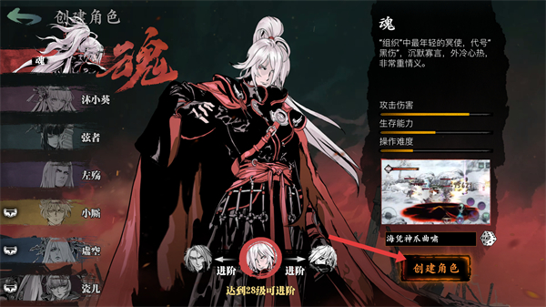 1、創(chuàng)建角色時(shí)可選擇如魂等不同角色,每個(gè)角色有不同屬性,選好后點(diǎn)擊創(chuàng)建角色進(jìn)入游戲。