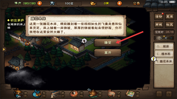 1、可在雕花木床處選擇睡覺(jué),恢復(fù)體力,為后續(xù)江湖冒險(xiǎn)儲(chǔ)備精力,推進(jìn)游戲進(jìn)程。