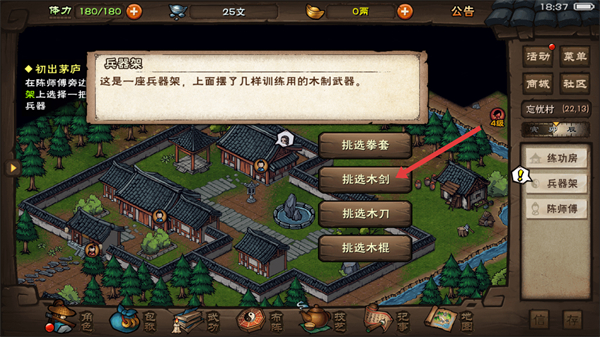 4、在兵器架處可挑選木劍等兵器,選擇后獲取兵器,提升角色戰(zhàn)斗能力,助力江湖戰(zhàn)斗。