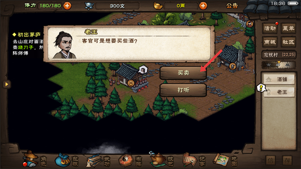 3、與酒鋪NPC老王對(duì)話時(shí)可選擇買賣,購(gòu)買酒水等物品,獲取資源,豐富游戲體驗(yàn)。