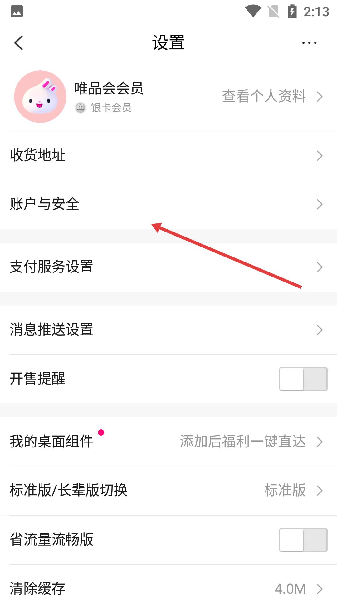 1、在唯品會設(shè)置頁,點(diǎn)擊賬戶與安全選項(xiàng),進(jìn)入后可管理登錄名、綁定手機(jī)等賬戶安全相關(guān)設(shè)置。