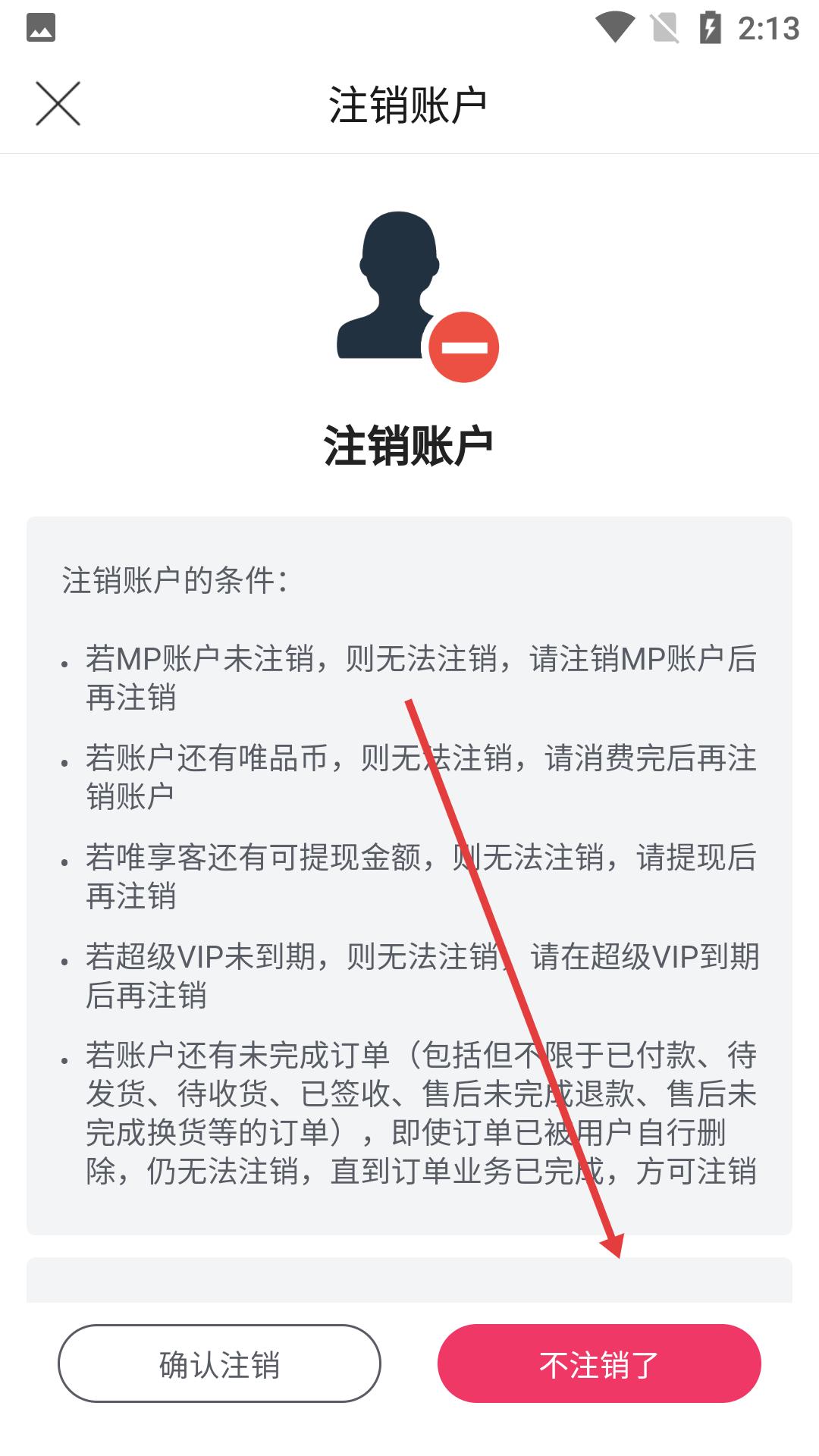 3、打開注銷賬戶頁,需先滿足MP賬戶已銷、唯品幣用完等條件,確認(rèn)后點(diǎn)確認(rèn)注銷,否則點(diǎn)不注銷了。