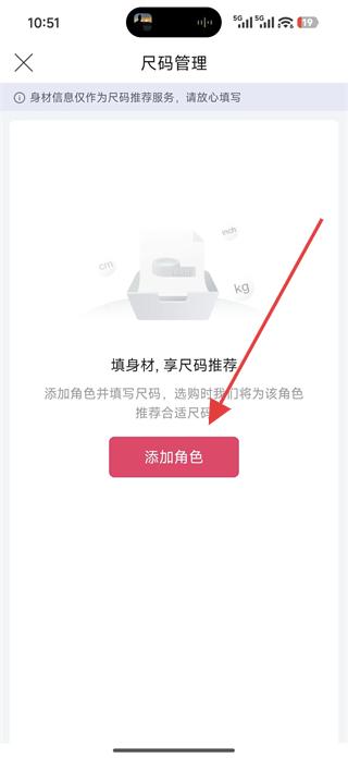 2、在尺碼管理頁面,看到填身材享尺碼推薦的提示,點(diǎn)擊添加角色,進(jìn)入添加角色的設(shè)置頁面。