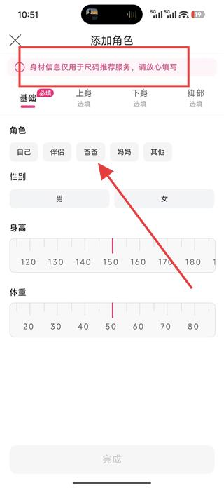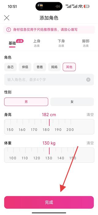 4、將角色的性別、身高、體重等信息設(shè)置完畢后,點(diǎn)擊完成按鈕,成功添加該角色,后續(xù)購物時就能獲得對應(yīng)的尺碼推薦。