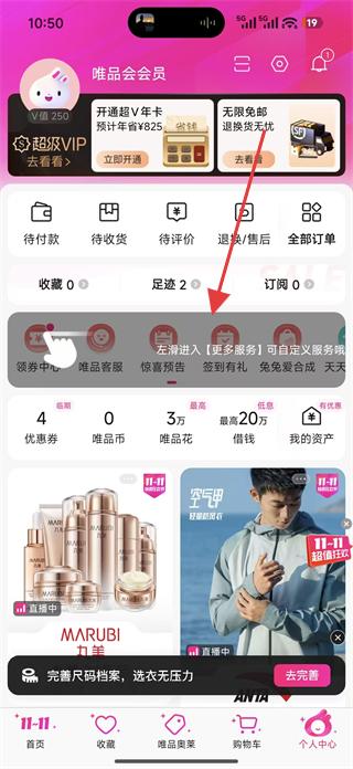 1、進(jìn)入唯品會個人中心頁面,找到尺碼管理的入口并點(diǎn)擊,進(jìn)入到尺碼管理的操作界面。
